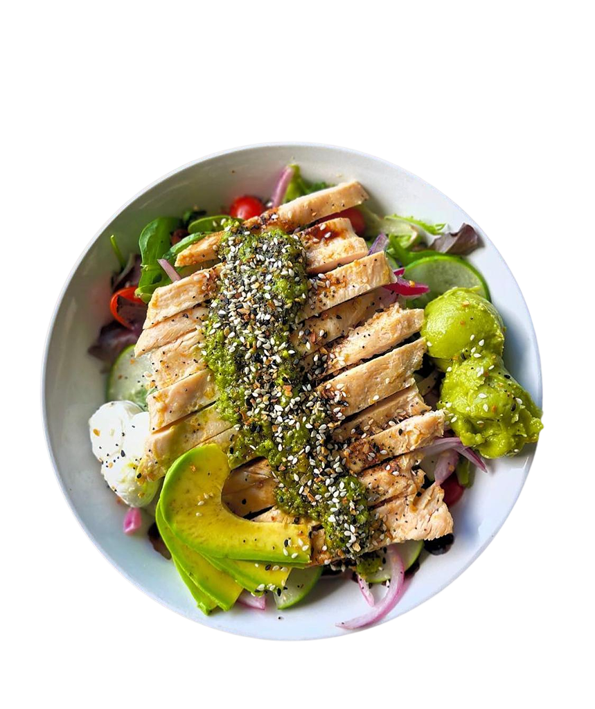 Una mezcla refrescante de green mix orgánica, jugosos tomates, pepinos, aguacate cremoso y tierna pechuga de pollo a la parrilla. Acompañada de mozzarella fresca, pesto casero y cebolla marinada, finalizada con un ligero glaseado balsámico para un balance perfecto entre frescura y sabor.