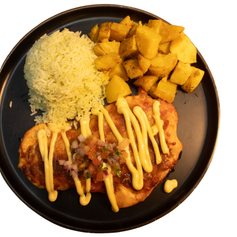 Jugosa pechuga de pollo a la parrilla, bañada en dulce y ahumada BBQ, cubierta con queso mixto derretido y finalizada con vibrante pico de gallo para ese toque fresco y crujiente.