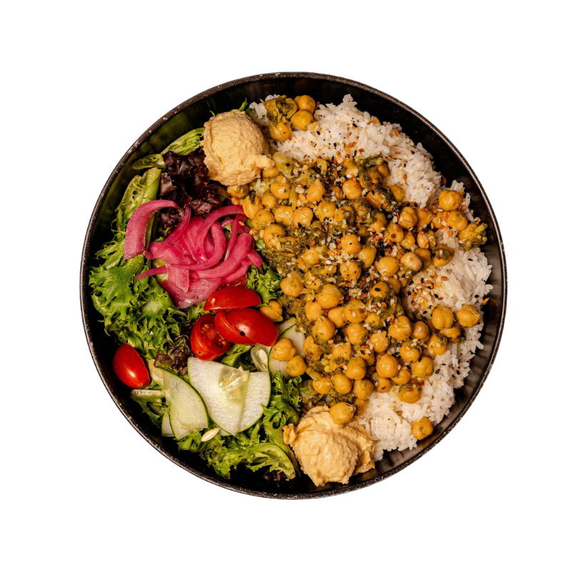 Fragante arroz jasmine o quinoa orgánica crean la base perfecta para este bowl lleno de nutrición, coronado con suaves garbanzos, jugosos tomates, crujientes pepinos y delicadas cebollas moradas marinadas.